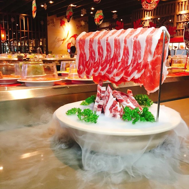 Chỉ mới xuất hiện trên bàn ăn lẩu băng chuyền tại Kichi Kichi, combo giết mổ bay này hối hả biến thành trọng điểm của mọi ánh nhìn với màn sương khói lạ mắt trong thố đá than hồng, như đưa thực khách về giữa mùa đông phương Bắc.